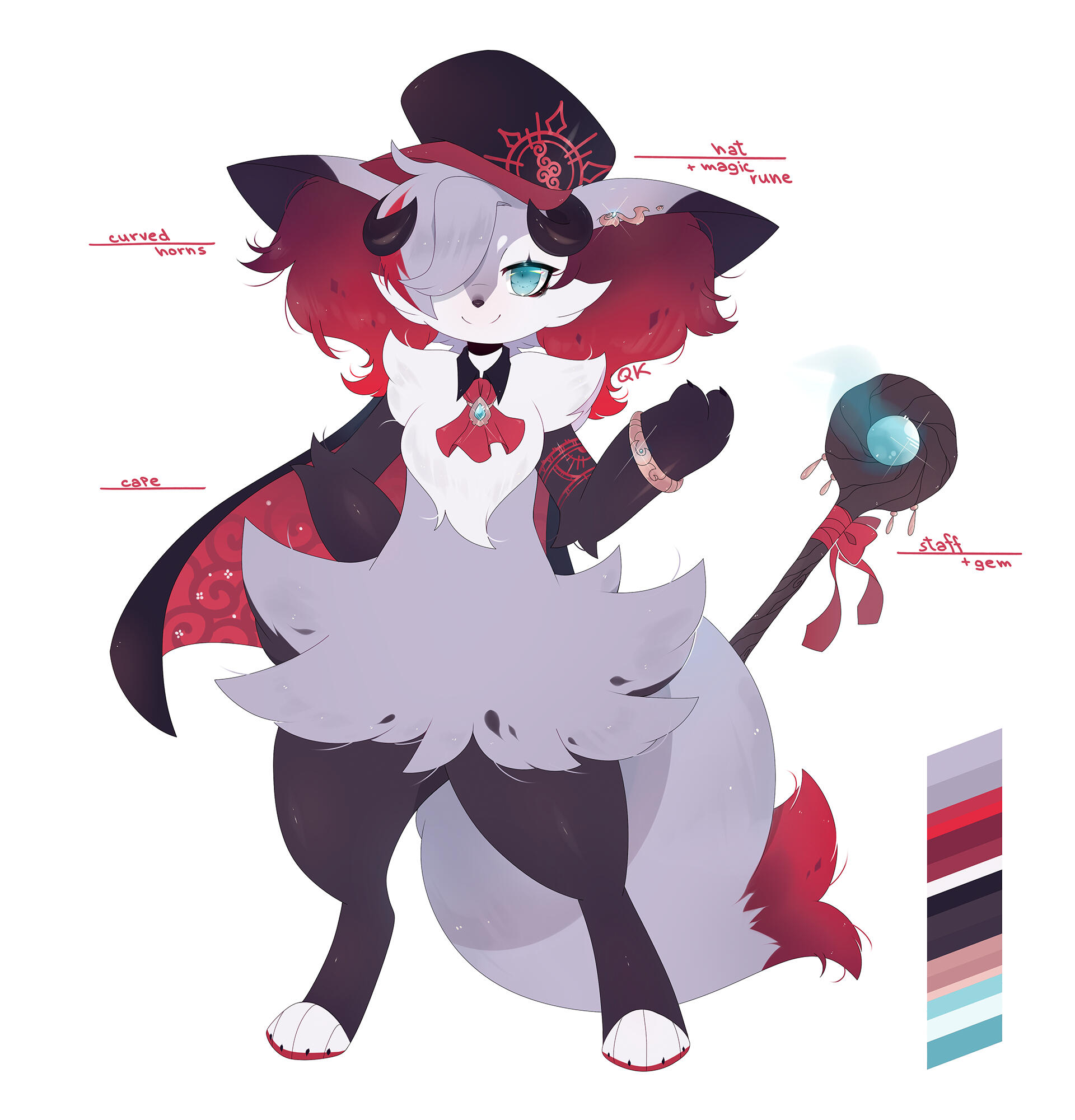 Complexity, as well as the client's specifications / preferences (specific markings, accessories, outfits, etc.) may increase the price, however base price will be kept if artistic freedom is given.(includes a clean colored fullbody sketch of the character, minimally rendered, small design notes and color palette, can also include other things such as name, gender, pronouns if requested)